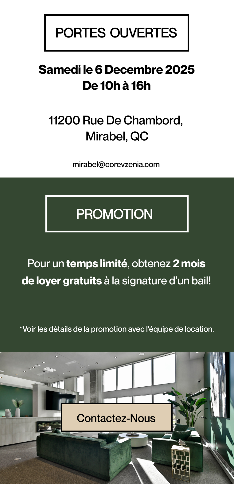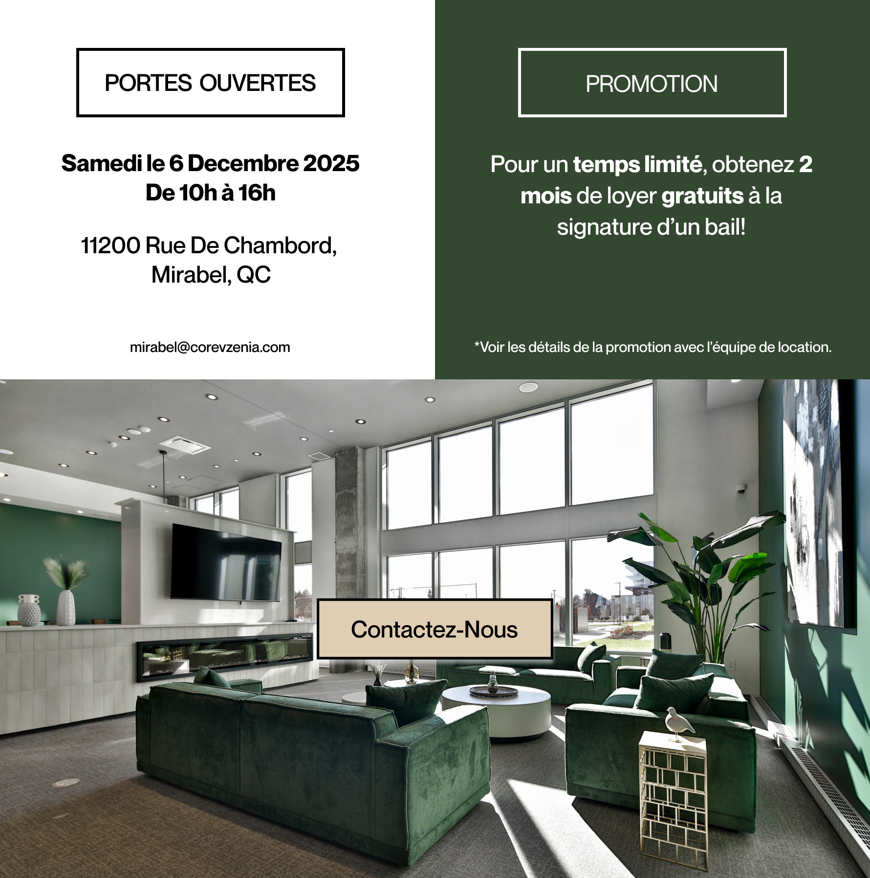 Zenia, conçu par le Groupe Corev, propose des appartements locatifs clés en main pour les 55 ans et plus, sans les contraintes d’une maison traditionnelle. Situés à Mirabel et Vaudreuil, nos immeubles offrent un accès facile aux commerces et services essentiels.