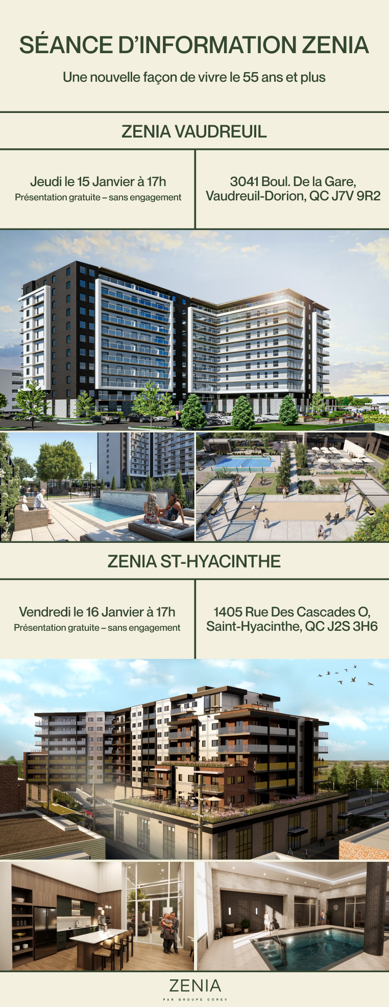 Zenia, conçu par le Groupe Corev, propose des appartements locatifs clés en main pour les 55 ans et plus, sans les contraintes d’une maison traditionnelle. Situés à Mirabel et Vaudreuil, nos immeubles offrent un accès facile aux commerces et services essentiels. Plus qu’un logement, Zenia favorise bien-être et convivialité grâce à des espaces communs tels qu’un atelier culinaire, des jardins aménagés et un simulateur de golf. Nos résidents profitent ainsi d’un cadre de vie dynamique, alliant indépendance et sérénité.